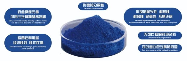 其他方面: 用于塑膠PVC-R/PVC-P/PP/PE/ABS/PC/PMMA/POM/PA/PET或PF紡絲等。群青可做全氟化樹脂的防老劑、氫化裂解催化劑、從海水中吸附油等。